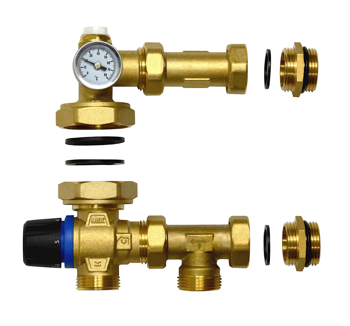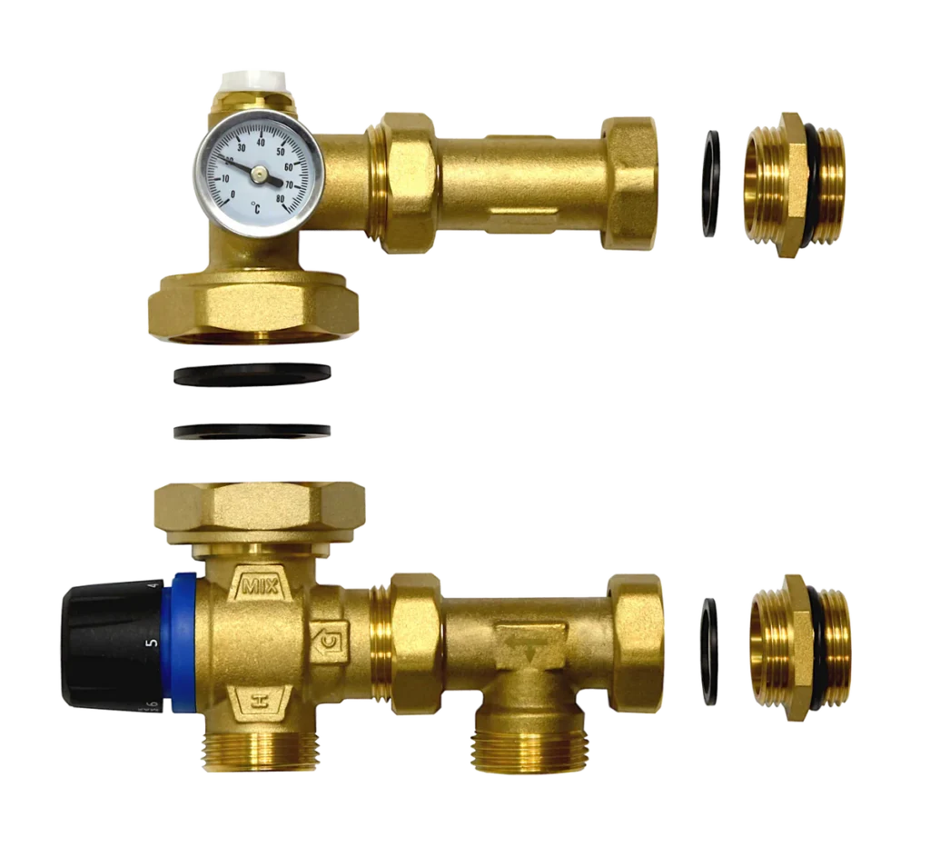 elementy podłączenia rozdzielacza 1” – dopasowane do standardowych rozdzielaczy ogrzewania podłogowego i grzejnikowego.
